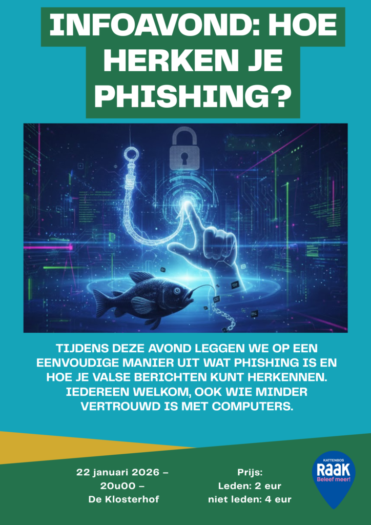 Phishing komt steeds vaker voor en wordt steeds slimmer. Tijdens deze infoavond leer je hoe je phishing herkent, welke vormen er bestaan en hoe je jezelf kan beschermen. Raak Kattenbos nodigt je uit op donderdag 22 januari voor een duidelijke en praktische infosessie.